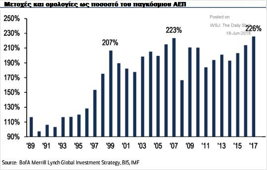 Τί λέει αυτό το διάγραμμα; Λέει ότι οι κάθε λογής χρηματοπιστωτικοί τίτλοι που κυκλοφορούν στον πλανήτη (μετοχές, ομολογίες κλπ) έφτασαν πλέον αντιστοιχούν στο 226% του παγκόσμιου ΑΕΠ, σημειώνοντας νέο ρεκόρ με ογδόντα τρισ. δολλαρίων μετοχές (λίγο πάνω από ένα παγκόσμιο ΑΕΠ) και εκατό τρισ. ομολογίες πάσης φύσεως.